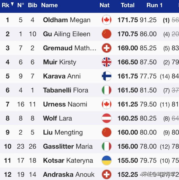 全部结束,谷爱凌170.75分排在第二,落后第一就1分。刘梦婷160分,排在第九,两个晋级决赛。