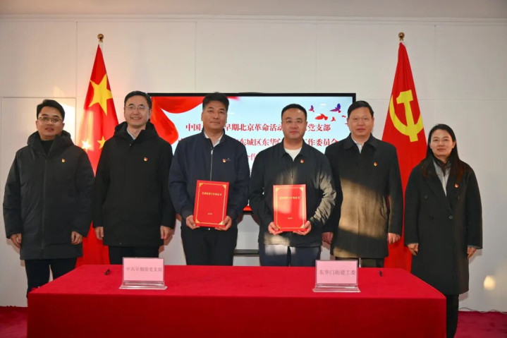 升旗仪式后,中国共产党早期北京革命活动纪念馆和东华门街道工委签署党建联建合作协议。双方围绕探索党建引领、街馆联动、文化赋能等文商旅体展新路径展开深度共建合作。东华门街道相关负责同志介绍,未来将通过街馆联建,串联起区域内红色地标,共同打造“从红楼走向红旗”党建联建品牌,推出“觉醒征途”Citywalk探访线路,共同打造集文化展陈、互动体验、公共服务于一体的地区党群服务综合体等,为推动“十五五”规划在京华大地的生动实践注入红色动能。